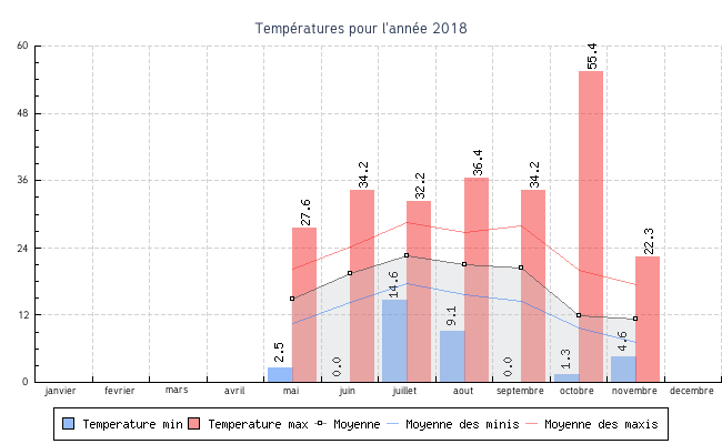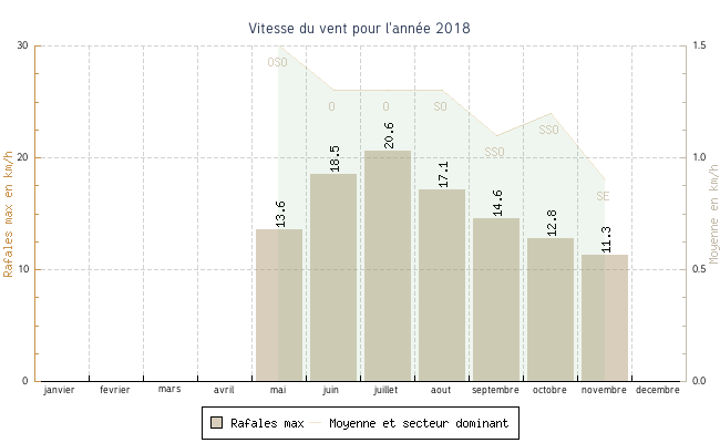| septembre | 0.0 °C | 14.4 °C | 34.2 °C | 27.9 °C | 20.4 °C | 1.1 km/h | 14.6 km/h | SSO |